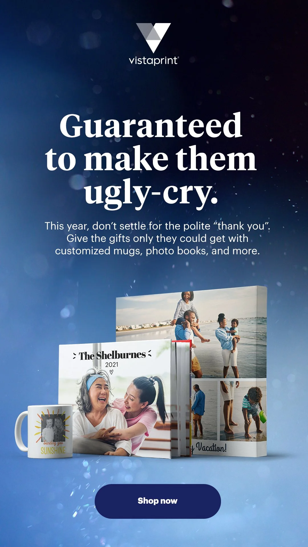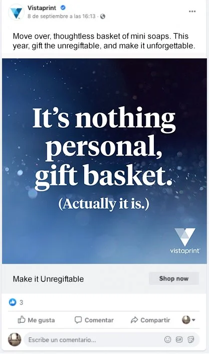 Each year, VistaPrint runs a holiday campaign targeting our lifestyle consumers purchasing holiday cards and customized gifts. In 2020, our campaign was based off the insight that people wanted to connect more with each other in the gifts they were sending, as Covid was preventing a lot of face-to-face get-togethers. Standard, off-the-shelf gifts were not as thoughtful and meaningful and gifts made especially for someone. And those custom gifts are not able to be regifted, not just because they are unique, but because they mean something to the recipients.
